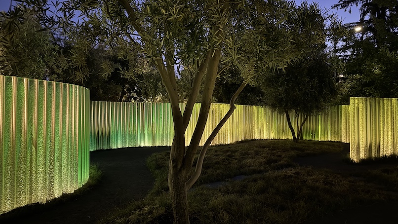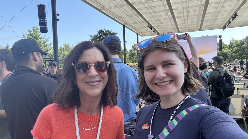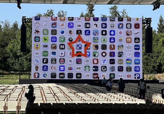 Monday is sort of the main event at Apple Park. The past two years, the event starts at 8:00 when you queue up at the visitor center and then walk over to Apple Park. Then Apple serves breakfast. The whole day is spent in their cafeteria, with the giant sliding doors opened to the outside. There on the outside is also where the big screen is located. At about 9:55 Tim Cook and Craig Federighi welcome everyone and then we all watch the keynote together. It's basically a giant watch party. Do bring sunscreen, this is prime roasting season. Apple has put up some sunshade now, but it's not enough to not get burned quickly. Also, there are still loads of seats that won’t be in the shade. The seats are first come first served, there are some seats reserved for Swift Student Challenge winners, but everywhere else you have to be early to reserve some good ones. This is great for my German primal instinct to get up at 7 and reserve a seat next to the pool by placing my towel there. I have been trained for this.